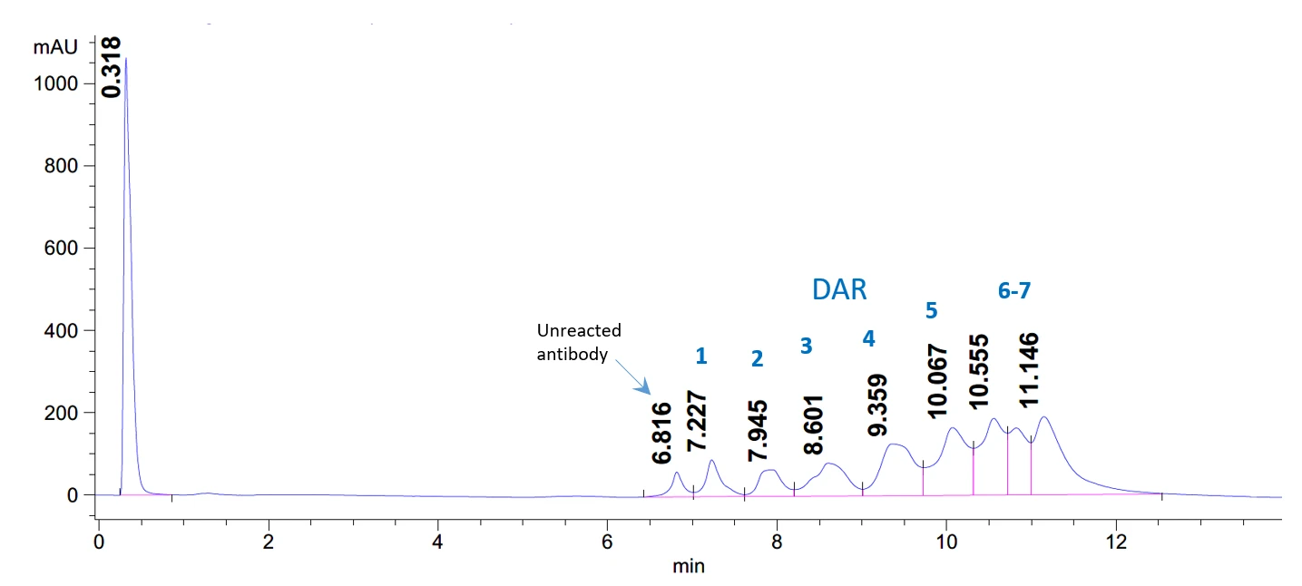 HIC is widely used for analyzing drug loading and heterogeneity in antibody–drug conjugates (ADCs). For ADCs prepared via reduced thiol conjugation, HIC HPLC can also be used to estimate the drug-to-antibody ratio (DAR). Antibodies with the same number of conjugated drug molecules (i.e., identical DAR) exhibit similar hydrophobicity and typically elute as a single peak. In contrast, ADC samples such as MMAE conjugates often display multiple peaks corresponding to species with varying drug loads.